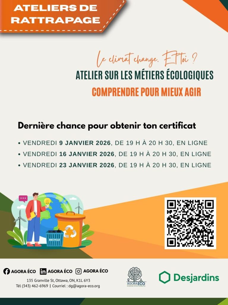Dans le cadre de son programme Métiers verts – Développement durable, AGORA ECO organise une série d’ateliers de rattrapage en ligne destinés aux participantes et participants n’ayant pas pu compléter l’ensemble des modules requis pour l’obtention du certificat. 📅 Dates des ateliers (en ligne) • Vendredi 9 janvier 2026 |